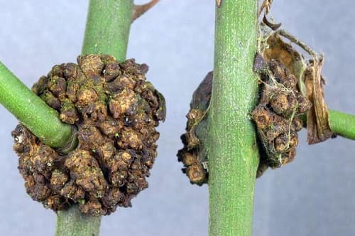 Biểu hiện: Xuất hiện các túi mật tròn trên thân hoặc rễ. Mật có màu xanh lục nhạt hoặc gần như trắng khi còn non. Khi chúng già đi, các khoang tối màu và trở thành gỗ, có kích thước từ những vết sưng nhỏ đến vết sưng lớn chiều ngang vài inch.